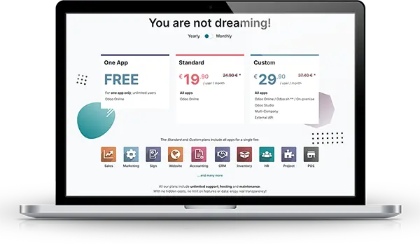 This plan serves small organizations alongside new businesses who want to use Odoo for their operations. You can get unlimited users on Odoo Online at no charge while having access to a single choice of the available apps. This plan excludes access to Odoo Studio as well as multi-company support and external APIs.